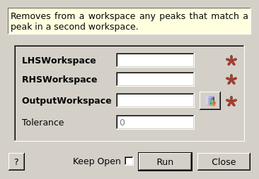 | OutputWorkspace | Output | PeaksWorkspace | Mandatory | The set of peaks that are in the first, but not the second, workspace. |
