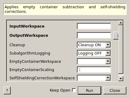 | EmptyContainerWorkspace | Input | MatrixWorkspace | An empty container workspace for subtraction from the input workspace. | |