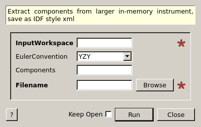 | InputWorkspace | Input | Workspace | Mandatory | Workspace containing the instrument to be exported |