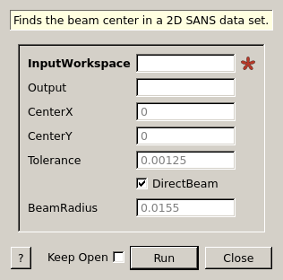 | DirectBeam | Input | boolean | True | If true, a direct beam calculation will be performed. Otherwise, the center of mass of the scattering data will be computed by excluding the beam area. |