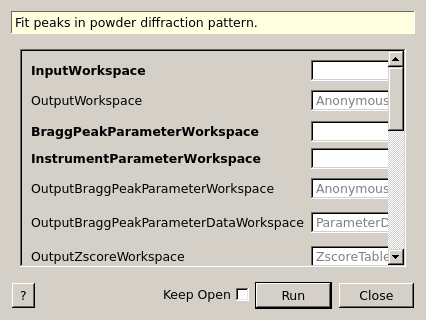 | InputWorkspace | Input | MatrixWorkspace | Mandatory | Input workspace for data (diffraction pattern). |