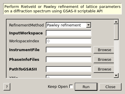 | RefinementMethod | Input | string | Pawley refinement | Refinement method (Rietvield or Pawley). Allowed values: [‘Pawley refinement’, ‘Rietveld refinement’] |