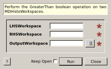 Perform the > (greater-than) boolean operation on two MDHistoWorkspaces or a MDHistoWorkspace and a scalar. The output workspace has a signal of 0.0 to mean “false” and a signal of 1.0 to mean “true”. Errors are 0.