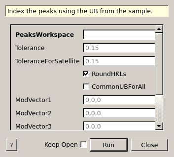 Given a PeaksWorkspace with a UB matrix stored with the sample, this algorithm will use UB inverse to index the peaks. If there are peaks from multiple runs in the workspace, the stored UB matrix will be used to get an initial indexing for the peaks from each individual run. Subsequently, a temporary UB matrix will be optimzed for the peaks from each individual run, and used to index the peaks from that run. In this way, a consistent indexing of the peaks from multiple runs will be obtained, which indexes the largest number of peaks, although one UB matrix may not produce exactly that indexing for all peaks, within the specified tolerance.