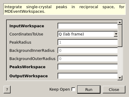 | PeaksWorkspace | Input | PeaksWorkspace | Mandatory | A PeaksWorkspace containing the peaks to integrate. |
