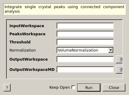 | PeaksWorkspace | Input | PeaksWorkspace | Mandatory | A PeaksWorkspace containing the peaks to integrate. |