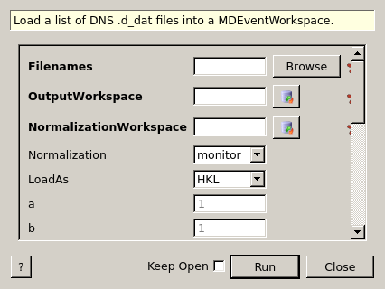 LoadAs Input string HKL Choose whether the algorithm should load raw dataor convert to H,K,L,dE space. Allowed values: [‘raw’, ‘HKL’]