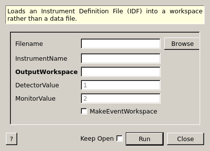 Loads an Instrument Definition File (IDF) into a workspace rather than a data file.