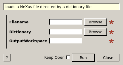 This algorithm is a flexible NeXus file loader. Data loading is driven by a dictionary. Correspondingly the algorithm takes as arguments: a filename, a path to a dictionary file and an output workspace name.