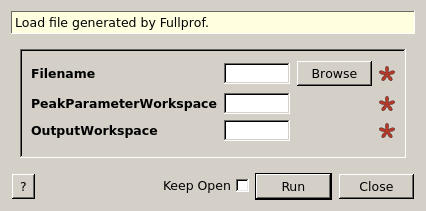 | Filename | Input | string | Mandatory | Name of [http://www.ill.eu/sites/fullprof/ Fullprof] .hkl or .prf file. Allowed extensions: [‘.hkl’, ‘.prf’, ‘.dat’] |