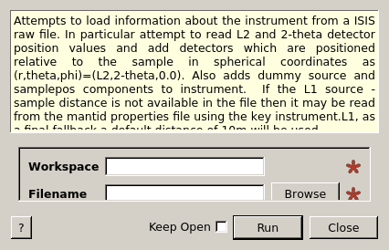 Attempts to load information about the instrument from a ISIS raw file. In particular attempt to read L2 and 2-theta detector position values and add detectors which are positioned relative to the sample in spherical coordinates as (r,theta,phi)=(L2,2-theta,0.0). Also adds dummy source and samplepos components to instrument. If the L1 source - sample distance is not available in the file then it may be read from the mantid properties file using the key instrument.L1, as a final fallback a default distance of 10m will be used.