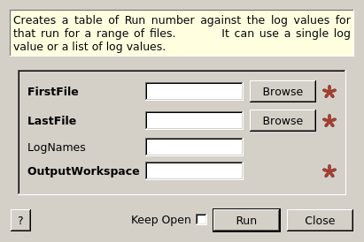Creates a table of Run number against the log values for that run for a range of files. It can use a single log value or a list of log values.
