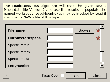 | Filename | Input | string | Mandatory | The name of the Nexus file to load. Allowed extensions: [‘.nxs’, ‘.nxs_v2’] |