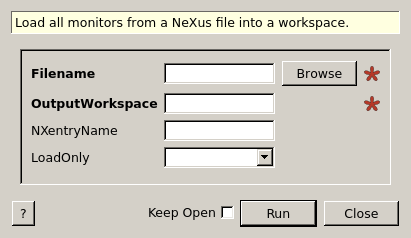 | OutputWorkspace | Output | Workspace | Mandatory | The name of the output workspace in which to load the NeXus monitors. |