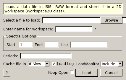 If only a portion of the data in the RAW file is required, then the optional ‘spectrum’ properties can be set before execution of the algorithm. Prior to loading of the data the values provided are checked and the algorithm will fail if they are found to be outside the limits of the dataset.