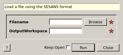 | Filename | Input | string | Mandatory | Name of the SESANS file to load. Allowed extensions: [‘.ses’, ‘.sesans’] |