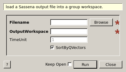 The Sassena application 1 generates intermediate scattering factors from molecular dynamics trajectories. This algorithm reads Sassena output and stores all data in workspaces of type Workspace2D, grouped under a single WorkspaceGroup.