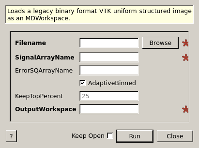 | AdaptiveBinned | Input | boolean | True | What type of output workspace to produce. If selected produces an [[MDEventWorkspace]], otherwise an [[MDHistoWorkspace]] is made. |