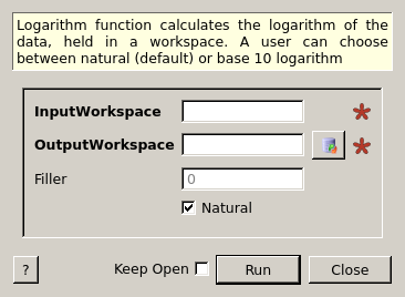Logarithm function calculates the logarithm of the data, held in a workspace. A user can choose between natural (default) or base 10 logarithm