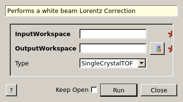 Type Input string SingleCrystalTOF Type of Lorentz correction to do. Allowed values: [‘SingleCrystalTOF’, ‘PowderTOF’]