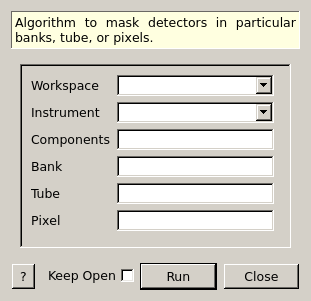 Algorithm to mask detectors in particular banks, tube, or pixels. To use the Bank argument, the instrument must be one of: ARCS, BIOSANS, CG2 CNCS, CORELLI, EQ-SANS HYSPEC, MANDI, NOMAD, POWGEN, SEQUOIA, SNAP, SXD, TOPAZ, WAND, WISH. For instruments with rectangular position sensitive detectors (POWGEN, SNAP, TOPAZ), the tube is corresponding to the x coordinate, and pixel to the y coordinate. For example, on SNAP Bank="1", Tube="3" corresponds to SNAP/East/Column1/bank1/bank1(x=3), and Bank="1", Tube="3", Pixel="5" is SNAP/East/Column1/bank1/bank1(x=3)/bank1(3,5).