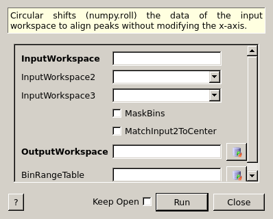 This algorithm circular shifts (numpy.roll operation) the Y- and E-values of each spectrum of an input workspace while keeping its X-values. Peak positions of the input workspace can be aligned with the centre of the X-axis as the default option. Optionally, a second input workspace can be given. In this case, the peaks in the first workspace will be aligned to the peaks in the second workspace. If MatchInput2ToCenter option is enabled, first workspace will be rolled according to the difference between the second workspace’s peaks from the center. If the third workspace is given, the first workspace will be shifted according to the difference of peak positions between the second and the third workspaces. A BinRangeTable output contains two values, ‘MinBin’ and ‘MaxBin’. Bins smaller than the ‘MinBin’ value and larger than the ‘MaxBin’ value represent bins that where overflown the x-axis range due to the circular shift. Enabling MaskBins will mask out these bins automatically.