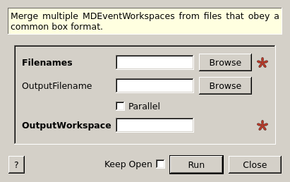 | Filenames | Input | list of str lists | Mandatory | Select several MDEventWorkspace NXS files to merge together. Files must have common box structure. Allowed extensions: [‘.nxs’] |