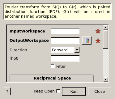 Fourier transform from S(Q) to G(r), which is paired distribution function (PDF). G(r) will be stored in another named workspace.