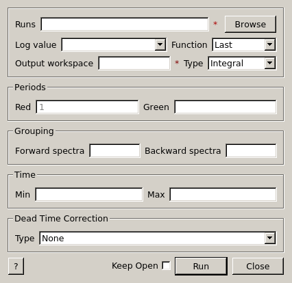 DeadTimeCorrType Input string None Type of Dead Time Correction to apply. Allowed values: [‘None’, ‘FromRunData’, ‘FromSpecifiedFile’]