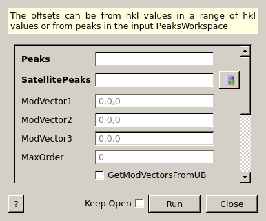 | SatellitePeaks | Output | PeaksWorkspace | Mandatory | Workspace of Peaks with peaks with fractional h,k, and/or l values |