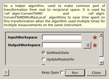 | UpdateMasksInfo | Input | boolean | False | If target workspace already exists as the result of previous deployment of this algorithm, the algorithm just updated masks states column instead of calculating the whole target workspace. The target workspace has to be appropriate for the source workspace This is temporary parameter and logic necessary until Mantid masks signal by 0 rather then NaN. |