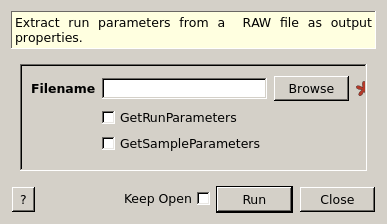 | GetRunParameters | Input | boolean | False | If this is true, the parameters from the RPB struct are placed into a TableWorkspace called Raw_RPB |