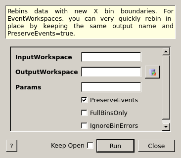 Rebins data with new X bin boundaries. For EventWorkspaces, you can very quickly rebin in-place by keeping the same output name and PreserveEvents=true.