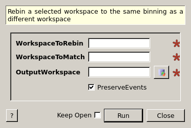 | WorkspaceToMatch | Input | MatrixWorkspace | Mandatory | The workspace to match the bin boundaries against. This must be a Histogram workspace, not Point data. If this is a problem try ConvertToHistogram. |