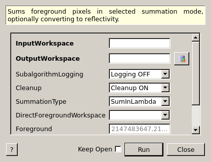 OutputWorkspace Output MatrixWorkspace Mandatory The summed foreground workspace.