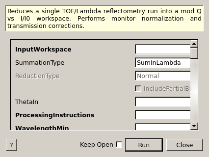 | Params | Input | dbl list | A comma separated list of first bin boundary, width, last bin boundary. These parameters are used for stitching together transmission runs. Values are in wavelength (angstroms). This input is only needed if a SecondTransmission run is provided. | |