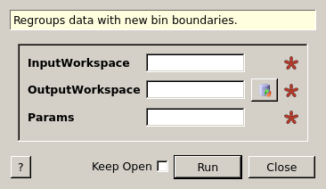 | Params | Input | dbl list | Mandatory | The new approximate bin boundaries in the form: x1,dx1,x2,dx2,…,xn |