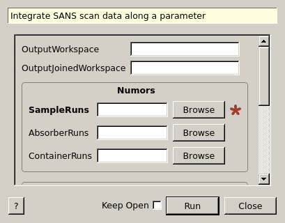 This algorithm allows the integration of data along a parameter. It has been designed for D16 along the Omega axis, but it can normally be applied to other instruments and techniques. Given a series of files with a parameter varying, this algorithm performs usual reduction for SANS detectors, and then produces a 2D ouput, with the x-axis being the x-axis of the detector, and the y-axis the parameter used for the scan. The data is thus the sum of each column of pixels of the detector, stacked one above the others and sorted by the integration parameter. The OutputJoinedWorkspace contains, if asked for, the reduced data on one workspace, along the axis defined by the parameter.