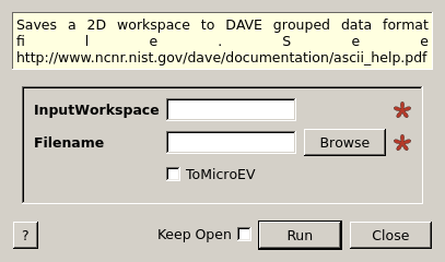 Saves a 2D workspace to DAVE grouped data format file.See http://www.ncnr.nist.gov/dave/documentation/ascii_help.pdf