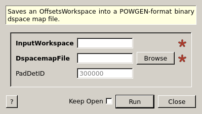 Saves an OffsetsWorkspace into a POWGEN-format binary dspace map file.