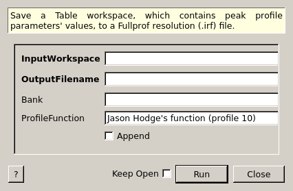 Save a Table workspace, which contains peak profile parameters’ values, to a Fullprof resolution (.irf) file.