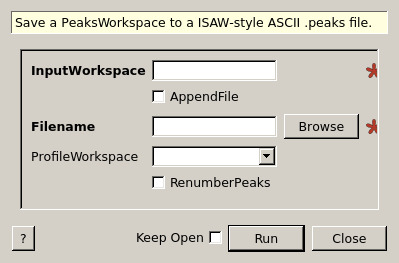 | Filename | Input | string | Mandatory | Path to an ISAW-style peaks or integrate file to save. Allowed extensions: [‘.peaks’, ‘.integrate’] |