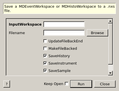 Save an MDEventWorkspace or a MDHistoWorkspace to a .nxs file. The workspace’s current box structure and entire list of events is preserved. The resulting file can be loaded via LoadMD.