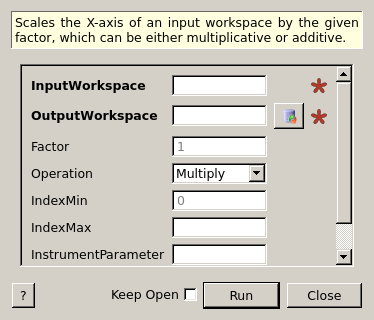 | Factor | Input | number | 1 | The value by which to scale the X-axis of the input workspace. Default is 1.0 |