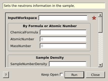 SampleMassDensity Input number Optional Measured mass density in g/cubic cm of the sample to be used to calculate the number density.