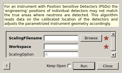 This algorithm was developed for the Merlin instrument but may be used with other instruments if appropriate scaling data is available. The scaling data should give the true centre point location of each pixel detector in the instrument. This may be obtained by a calibration run and post-processing of the results. Since the calibration data may vary with time, it is not convenient to store it in the instrument XML definition file. Instead it can be stored as an ACSII file with the extension “.sca” or within the “.raw” file associated with the data, as data on the position of each detector (r,theta,phi).