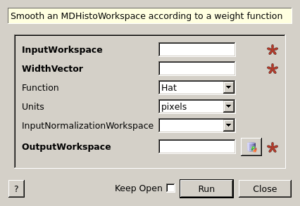 | InputWorkspace | Input | IMDHistoWorkspace | Mandatory | An input MDHistoWorkspace to smooth. |
