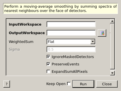 | ExpandSumAllPixels | Input | boolean | False | OuputWorkspace will have same number of pixels as InputWorkspace using SumPixelsX and SumPixelsY. Individual pixels will have averages. |
