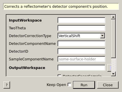 | DetectorCorrectionType | Input | string | VerticalShift | Whether detectors should be shifted vertically or rotated around the sample position. Allowed values: [‘VerticalShift’, ‘RotateAroundSample’] |