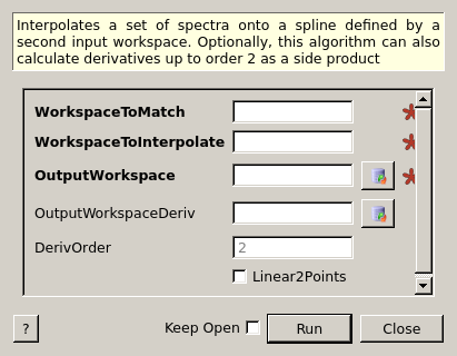 Interpolates a set of spectra onto a spline defined by a second input workspace. Optionally, this algorithm can also calculate derivatives up to order 2 as a side product